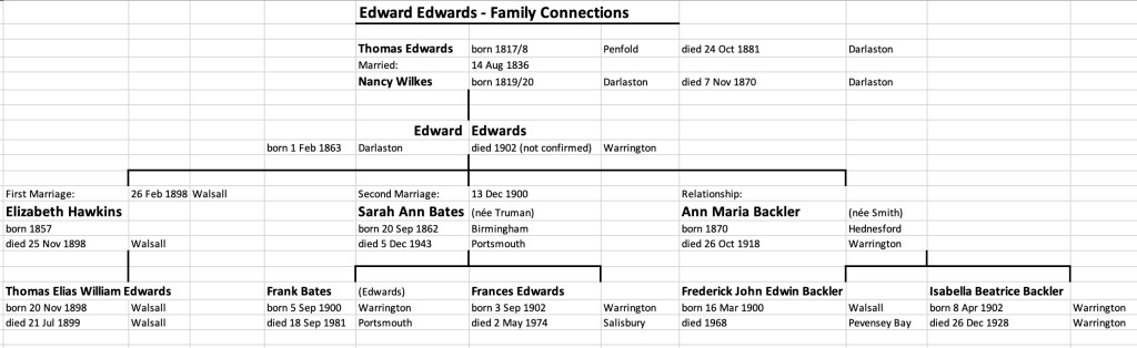 Edward chose to move to Warrington, where his sister Nancy Keating (née Edwards) was living with her family according to the 1901 and 1911 censuses. Edward met Sarah Ann Bates, a widow, who had four daughters and a son living with her. She had lost her husband George Bates and also, more recently, had just seen another daughter Henrietta Bates pass away too. Sarah became pregnant with Jon’s grandfather Frank Bates, who was born on 5th September 1900. Jon could not be sure that Edward was the father. On 13th December 1900 in Warrington, Edward and Sarah Ann entered into their second marriages. It seems likely that Edward would not have wanted, so soon, to take on the responsibility of five Bates children, if he wasn’t Frank’s father.