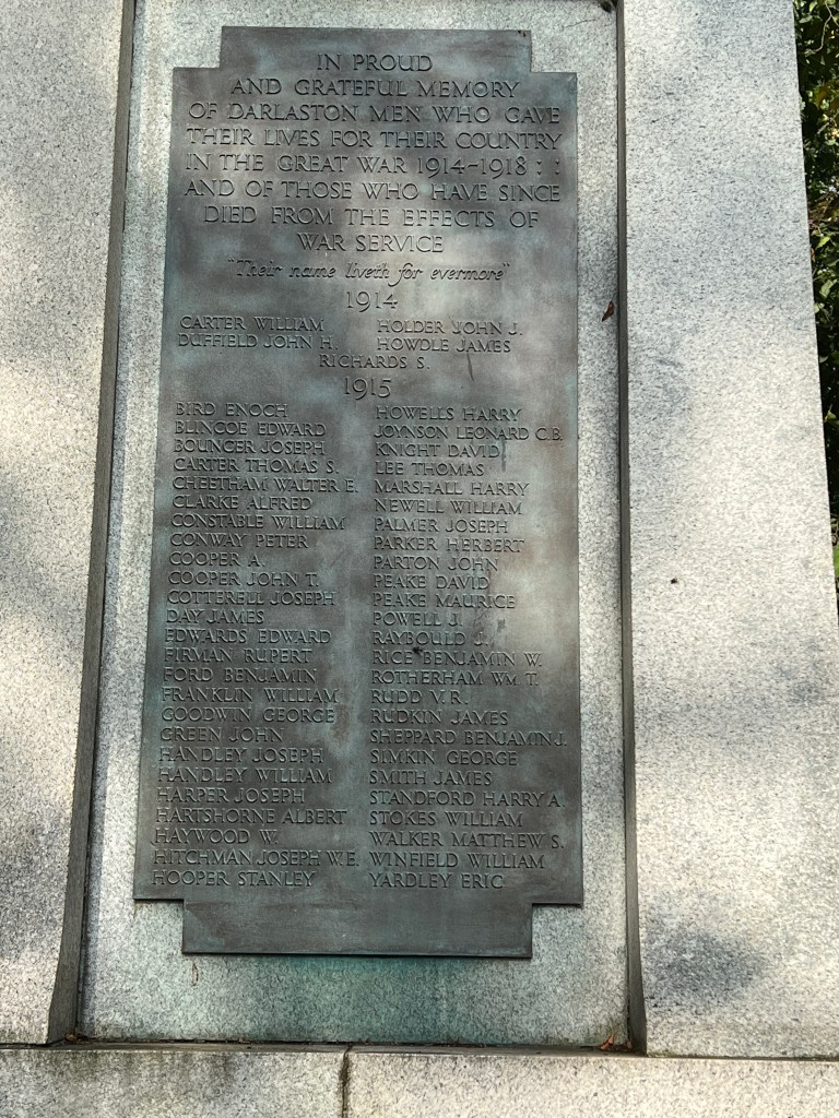 I also took pictures of Darlaston Town Hall and the War Memorial across the road. There is an Edward Edwards on the war memorial, thirteenth up from bottom left, but I don’t think it is my Edward Edwards, because there was another living in the area at the time. I can’t be sure for the moment, but there is a military record that suggests it is not our man. More research needed.