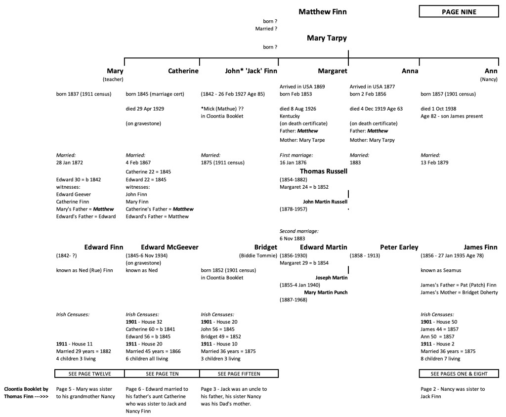 Combining the details from Thomas Finn’s booklet with these two censuses, yielded the following table, labelled Page 9, because it is part of a set of 16 pages. I have noted on this chart the 1901 and 1911 census connections and the references contained within Thomas Finn’s booklet. This chart captures the family in Ireland before any of the siblings emigrated to the USA.