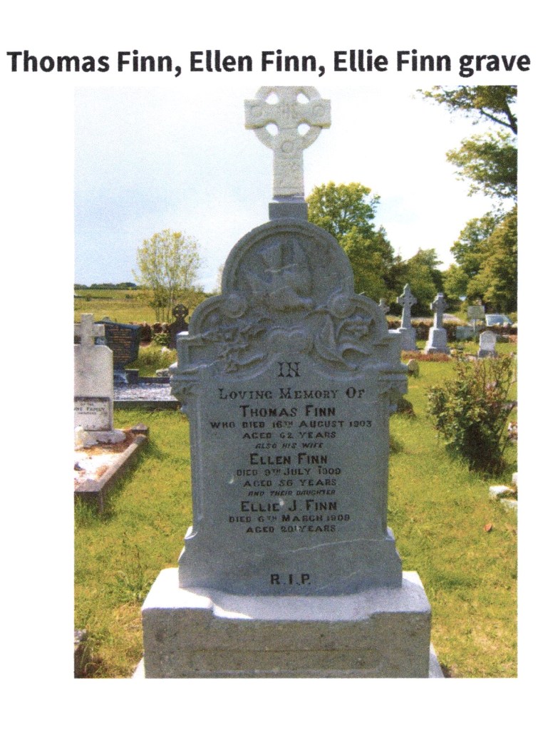 Patrick’s parents were Thomas Finn and Ellen Gorman, who have been featured in a blog post “More on Finns in the USA” in the penultimate paragraph. Patrick’s siblings are mentioned in this paragraph. Their gravestone also featured one of their younger daughters, Ellen J Finn (Ellie).